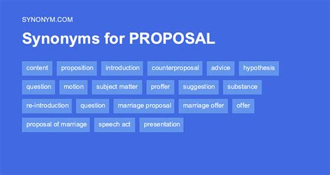 Synonyms For Proposal - Find synonyms for proposal in different contexts, such as a plan, a rule, a strategy, or a statement. See example sentences, related articles, and nearby. Find 29 different ways to say proposal, such as bid, idea, offer, plan, project, proposition, and more. What's the definition of proposal in thesaurus? Find 33 similar words for proposal, such as suggestion, offer, proposition,.